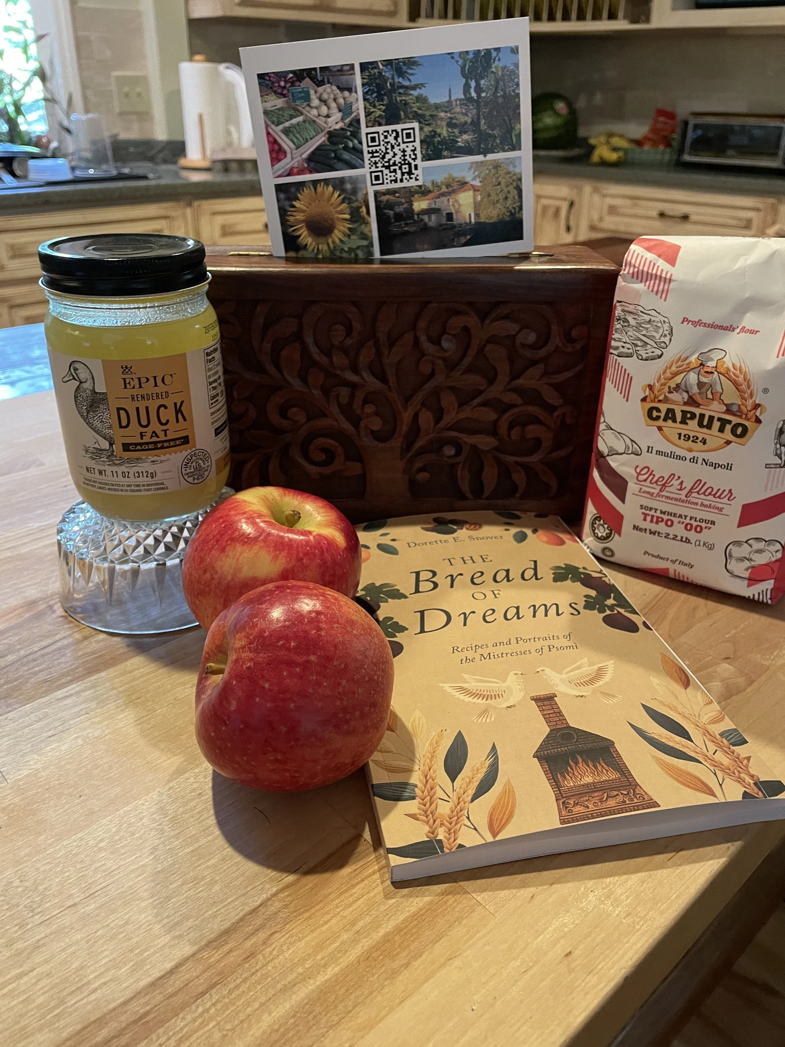 1. A packet of Mistress Levain (dried sourdough starter) label of Miel Nerra, the MC of my most recently released novel, The Mistress of Apples and Becasse.